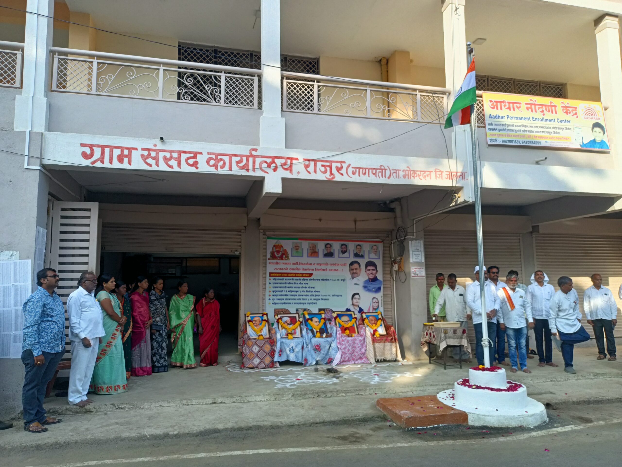 श्रीक्षेत्र राजुर: भोकरदन तालुक्यातील राजुर येथे ग्रामसंसद कार्यालयात मराठवाडा मुक्तीसंग्राम दिन मोठ्या उत्साहात साजरा करण्यात आला.यावेळी माजी ग्राम पंचायत सदस्य आप्पासाहेब पुंगळे यांच्या हस्ते ध्वजारोहण करण्यात आले. तसेच गणपती संस्थान विश्वस्त गणेशराव साबळे,पंचायत समिती कर्मचारी कृष्णा पुंगळे,प्रा.बाळासाहेब बोराडे, लक्ष्मण कांबळे,विष्णू म्हसरूप आदी मान्यवरांच्या हस्ते महापुरुषांच्या प्रतिमांचे पूजन करण्यात आले. राष्ट्रगीत व महाराष्ट्र गीत झाल्यानंतर विद्यार्थ्यांनी मराठवाडा मुक्ती संग्राम दिनाचा विजय असो,भारत माता की जय,वंदे मातरम अशा घोषणा दिल्या.