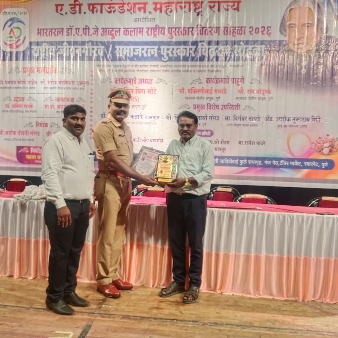 श्रीक्षेत्र राजूर:येथील लोकशाहीर साहेबराव पवार यांना ए.डी.फाउंडेशन यांच्यावतीने दिला जाणारा भारतरत्न डॉ.ए.पी.जे.अब्दुल कलाम जीवन गौरव पुरस्कार महात्मा जोतिबा फुले यांच्या जयंती निमित्त पुणे येथील वरिष्ठ पोलीस निरीक्षक विजय गोरड यांच्या हस्ते देऊन सन्मानित करण्यात आले.